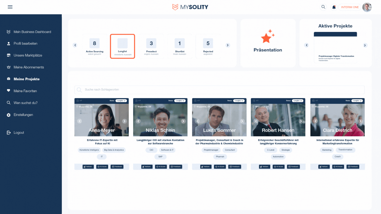 Executive Programm: Mit dem neuen Executive Programm geht MYSOLITY noch einen Schritt weiter. Unternehmen erhalten Zugang zu einem Kreis von Executives, die sie bei der Suche und Besetzung von Interim Manager:innen persönlich begleiten. Damit verbindet die Plattform die Vorteile einer digitalen Plattform mit der Qualität individueller Beratung und ermöglicht jede Form die besten Kandidat:innen auszuwählen.