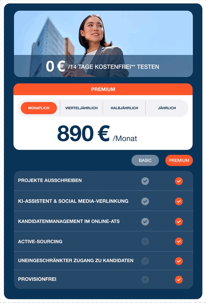 Mit einem Premium-Account genießen Provider stets die volle Sichtbarkeit aller Kandidat:innen. Beim Active Sourcing haben sie Zugang zu Basic- und Premium-Mitgliedern auf allen Marktplätzen. Wenn sich Kandidat:innen auf ein Projekt bewerben, das ein Premium Provider ausschreibt, sieht dieser uneingeschränkt sowohl die Basic als auch die Premium-Kandidat:innen. Provider mit einem Basic-Account sehen Basic-Kandidat:innen bei einer Bewerbung erst nach einer Freischaltung; für die Vermittlung fallen höhere Provision an als für Premium-Kandidat:innen.