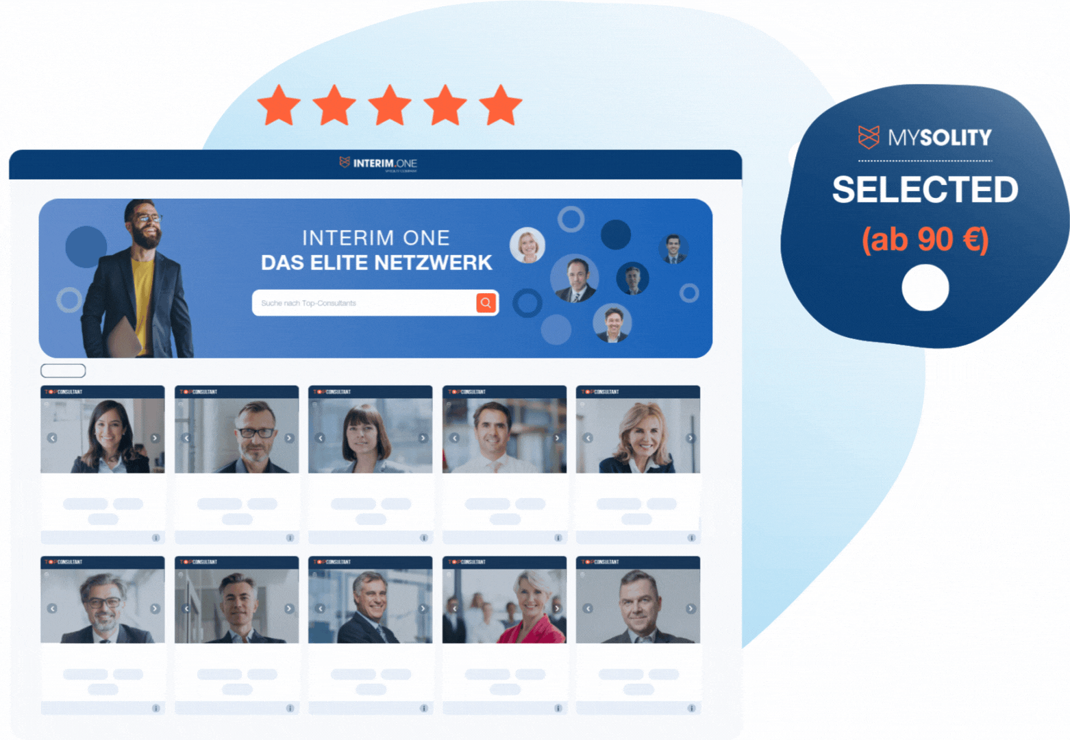 Mit einer Premium*Plus-Mitgliedschaft kannst du dein Profil noch weiter aus der Masse von tausenden Kandidaten hervorheben. Erweitere deine Sichtbarkeit, indem du deinem Profil ein exklusives Gütesiegel als Top Consultant hinzufügst, mit dem du dich auf einer vorselektierten Plattform präsentieren kannst, die bei vielen Unternehmen und relevanten Projektvermittlern eine besondere Aufmerksamkeit und Neugierde erzeugt. Genieße den Vorteil, mit deinem Profil besonders hervorgehoben zu werden und damit noch besser sichtbar zu sein als andere Premium-Mitglieder. Auch bei deinen Bewerbungen sticht das Top-Consultant-Siegel besonders hervor und weckt im Kreis zahlreicher Bewerber das besondere Interesse der Projektanbieter. Premium-Plus-Mitglieder haben zudem die Option, sich der Jury für das Interim.One Portal zu stellen, um sich dem Elite-Netzwerk anzuschließen.